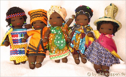 Jede dieser Puppen wird in langwieriger und liebevoller Handarbeit hergestellt. Das Besondere: alle diese Puppen sind jewweils in traditionelle Gewänder eines der in Südafrika lebenden Volksstämme gekleidet.